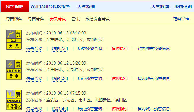 深圳市氣象臺于2019年06月13日08時10分在全市發(fā)布大風(fēng)黃色預(yù)警,預(yù)計平均風(fēng)力將達(dá)8級以上(或陣風(fēng)10級以上),信號可能從今天夜間持續(xù)到明天早晨,停止高空、水上等戶外作業(yè),撤離危險地帶人員;船舶采取有效措施避風(fēng),請市民遠(yuǎn)離海邊,盡量避免海上活動。