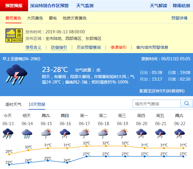 深圳新聞網(wǎng)2019年6月13日訊(記者 施冰冰)深圳市氣象局預(yù)計13日凌晨至夜間我市有暴雨、局部大暴雨,伴有雷暴,局部地區(qū)有8級左右的短時大風(fēng)。14日白天降雨逐漸減弱。15-16日多云,有陣雨或雷陣雨,17-19日多云炎熱。