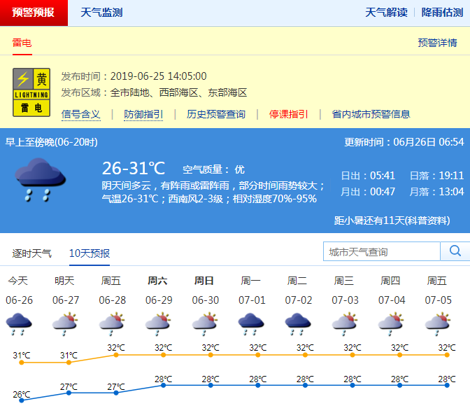 市氣象局預計深圳今日氣溫26-31℃;陰天間多云,有陣雨或雷陣雨,部分時間雨勢較大;西南風2-3級;相對濕度70%-95%。提醒市民未來幾天雷陣雨多發(fā),注意躲避雷暴和局地短時強降水。
