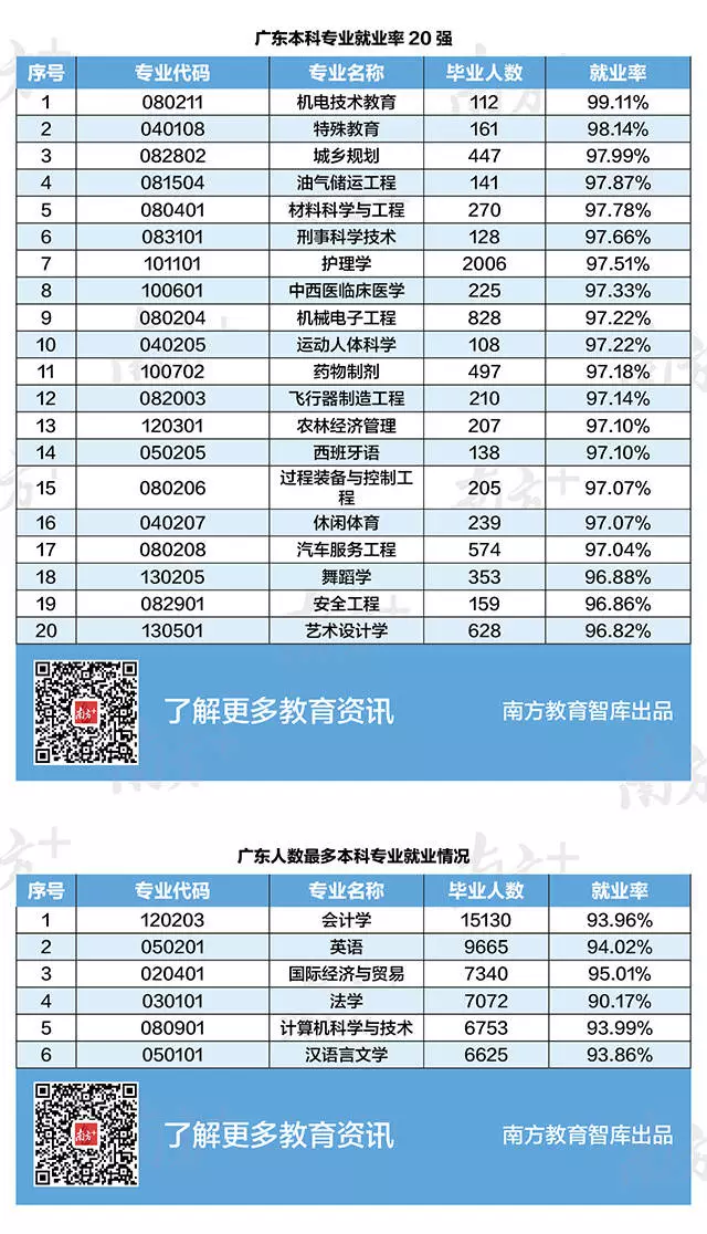 2018年廣東本科畢業(yè)生初次就業(yè)率為93.84%。就業(yè)率最高前20名中,屬工科類的專業(yè)最多,有10個。