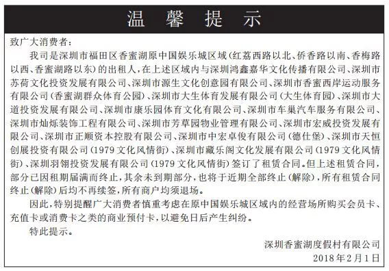 2018年2月1日,深圳香蜜湖度假村有限公司(原香蜜湖中國娛樂城區(qū)域的出租人)發(fā)布了所有商戶均須退場的公告。
