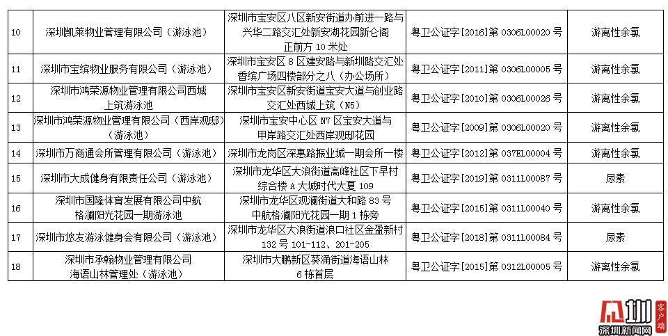 記者獲悉,深圳市夢(mèng)六健身有限公司(游泳池)pH值和游離性余氯指標(biāo)不合格,深圳市百利行物業(yè)發(fā)展有限公司中信紅樹(shù)灣花城物業(yè)管理處(游泳池)、深圳市大成健身有限責(zé)任公司(游泳池)、深圳市悠友游泳健身會(huì)有限公司(游泳池)尿素指標(biāo)不合格,加福投資(深圳)有限公司福朋喜來(lái)登酒店(游泳池)、深圳市蓮花物業(yè)管理有限公司彩田村游泳場(chǎng)、深圳大中華國(guó)際酒店管理有限公司大中華希爾頓酒店(游泳池)、深圳市京基物業(yè)管理有限公司濱河時(shí)代物業(yè)服務(wù)中心(游泳池)、深圳新都酒店股份有限公司新都酒店(游泳池)、深圳陽(yáng)光酒店(游泳池)、深圳市金地物業(yè)管理有限公司翠盈嘉園管理處(游泳池)、深圳凱萊物業(yè)管理有限公司(游泳池)、深圳市寶繽物業(yè)服務(wù)有限公司(游泳池)、深圳市鴻榮源物業(yè)管理有限公司西城上筑游泳池、深圳市鴻榮源物業(yè)管理有限公司(西岸觀?。ㄓ斡境兀?、深圳市萬(wàn)商通會(huì)所管理有限公司(游泳池)、深圳市國(guó)隆體育發(fā)展有限公司中航格瀾陽(yáng)光花園一期游泳池、深圳市承翰物業(yè)管理有限公司海語(yǔ)山林管理處(游泳池)游離性余氯指標(biāo)不合格。衛(wèi)生監(jiān)督部門(mén)已責(zé)令抽檢結(jié)果不合格單位立即整改,并跟蹤整改情況。