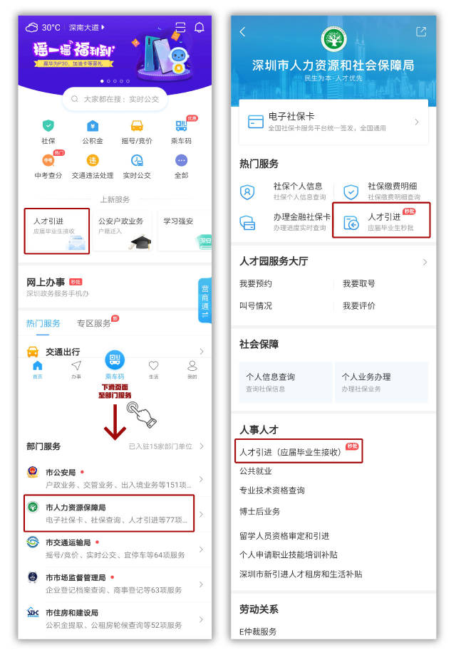 在“i深圳”APP首頁下拉至“部門服務”列表,進入深圳市人力資源保障局專區(qū),然后選擇“人才引進”。