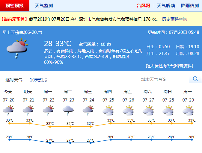 預計20日多云為主,有雷陣雨,局部地區(qū)有大雨,雷雨時伴有7-8級短時大風;氣溫27-32℃;西南風2-3級;相對濕度60%-90%。21-24日有陽光,多陣雨,午后部分時間雨勢較大;展望25日起天氣再趨炎熱。