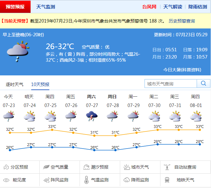 深圳新聞網(wǎng)2019年7月23日訊 市氣象局預(yù)計深圳23日多云為主,有(雷)陣雨,部分時間雨勢較大,局部地區(qū)雨量可達中到大雨量級;氣溫27-32℃,中午前后體感略顯悶熱;西南風(fēng)2-3級;相對濕度65%-95%。24-26日轉(zhuǎn)炎熱天氣,午后易激發(fā)熱對流性降雨,最高氣溫33-35℃;27-28日降雨增多,部分時間雨勢較大。