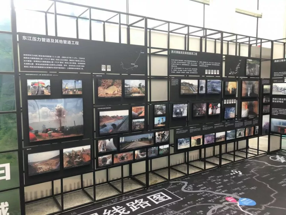 第三部分“清清東江水汩汩入鵬城”,著重展示東江水源工程建設的全過程。以工程線路為展覽線索,再現(xiàn)水務工作者在長達106公里的戰(zhàn)線上奮戰(zhàn)的場面。通過輸水設施的新舊照片對比,描繪出一條在深惠兩城平地崛起的深圳“生命線”。