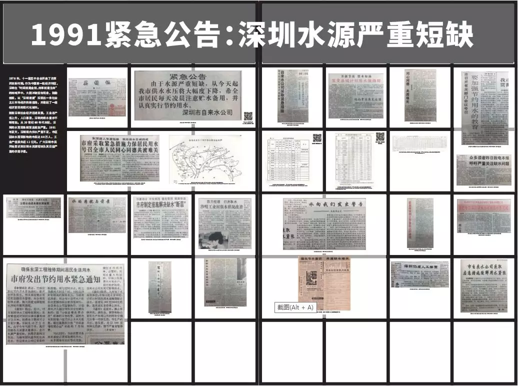 第一部分以“1991緊急公告:深圳水源嚴重短缺”為題,透過多份1991年深圳水荒的相關(guān)報道以及有關(guān)資料,讓觀者了解一個曾經(jīng)極度缺水的深圳。