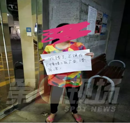 ▲女子手持道歉牌,上面寫著:“我錯(cuò)了,不應(yīng)該在E棟樓上發(fā)廣告,請(qǐng)?jiān)彙?/p>