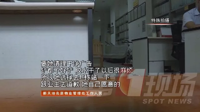 當(dāng)時(shí)這名女子在小區(qū)E棟樓層里張貼小廣告,物業(yè)發(fā)現(xiàn)后把她帶到管理處,要求她自行清理掉自己張貼的所有廣告,或者道歉,二者選其一。