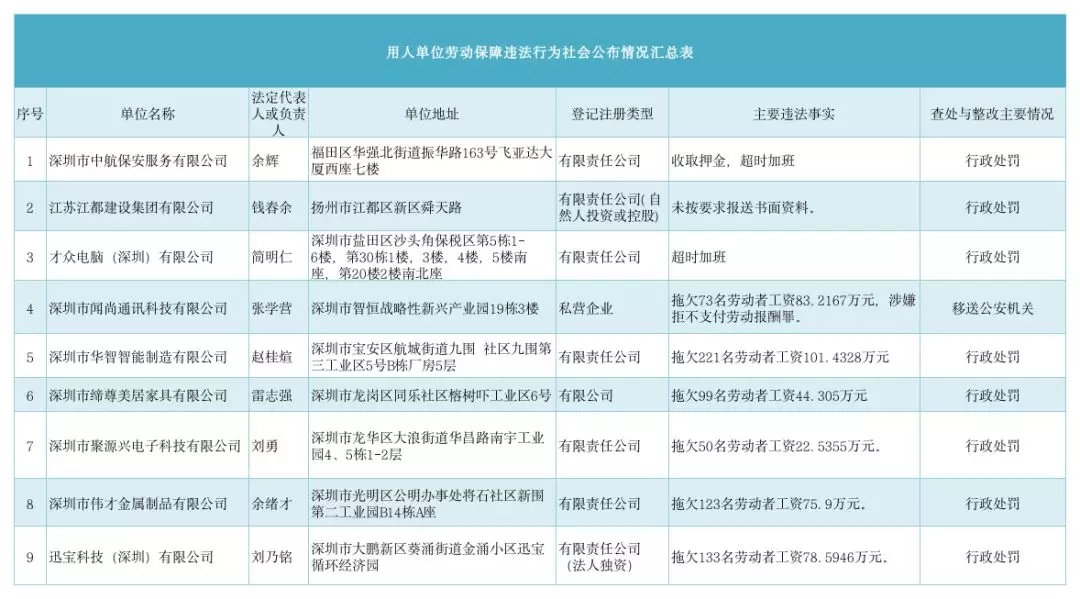 記者了解到,2019年第二季度深圳市人力資源部門繼續(xù)加大對(duì)欠薪等勞動(dòng)保障違法行為的打擊力度,依法處罰,對(duì)涉嫌犯罪的堅(jiān)決移送司法機(jī)關(guān),切實(shí)維護(hù)勞動(dòng)者的合法權(quán)益。為加強(qiáng)對(duì)違法用人單位的社會(huì)監(jiān)督,強(qiáng)化誠信體系建設(shè),加大威懾力,依據(jù)《廣東省用人單位重大勞動(dòng)保障違法行為社會(huì)公布暫行規(guī)定》和《深圳市勞動(dòng)保障違法信息公布辦法》,現(xiàn)將部分區(qū)(新區(qū))人力資源部門查處的一批勞動(dòng)保障違法案件予以公布。