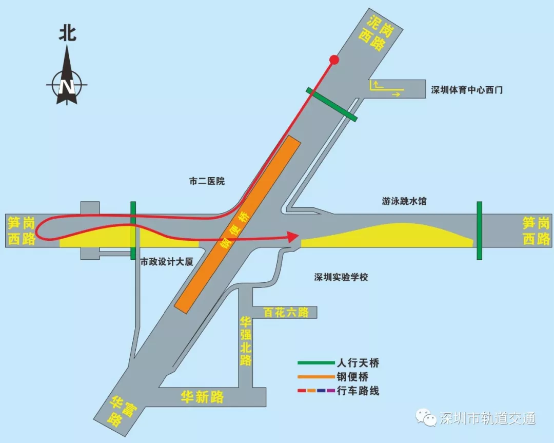 北轉(zhuǎn)東(泥崗西路左轉(zhuǎn)筍崗西路):泥崗西路通過(guò)市二醫(yī)院旁三車道的過(guò)境車道或橋墩之間的新建車道右轉(zhuǎn)筍崗西路,隨后在掉頭口處掉頭,直行通過(guò)原平交路口,完成左轉(zhuǎn)。(詳見圖8)