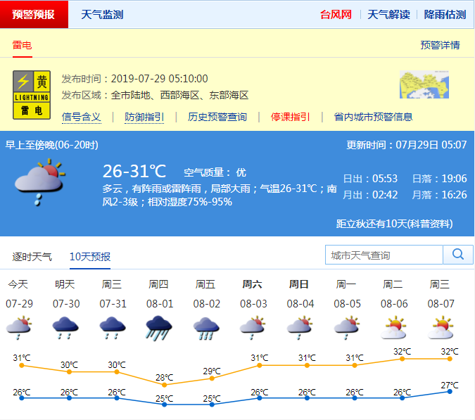 見圳客戶端·深圳新聞網(wǎng)2019年7月29日訊 今天多云有雷陣雨,局部大雨;26-31℃;南風2-3級;濕度75%-95%。預計30-31日陰天間多云,有雷陣雨,局部暴雨;8月1日-2日有一次暴雨降雨過程;8月3日-5日降雨減弱,多云有陣雨或雷陣雨。