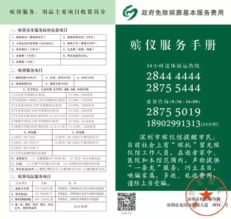 “深圳只有一家合法的殯儀館,就是深圳市殯儀館,其殯儀收費標(biāo)準(zhǔn)可以通過‘深圳民政在線’的‘殯儀服務(wù)’查詢。”市殯管所相關(guān)負(fù)責(zé)人表示,市民也可以關(guān)注“深圳市殯儀館”的微信公眾號查詢治喪流程、聯(lián)系電話和收費標(biāo)準(zhǔn)。