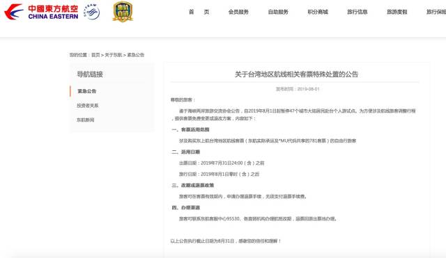 繼深航之后,東航也剛剛發(fā)布了關(guān)于臺(tái)灣地區(qū)航線相關(guān)客票特殊處置的公告:涉及購買東航臺(tái)灣地區(qū)航線客票(東航實(shí)際承運(yùn)及*MU代碼共享的781客票)的自由行旅客,出票日期在2019年7月31日24:00(含)之前,旅行日期在2019年8月1日零時(shí)(含)之后的,旅客可在客票有效期內(nèi),申請辦理退票手續(xù),無須支付退票手續(xù)費(fèi)。