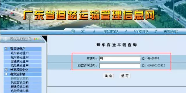 登錄廣東省道路運輸管理信息網(wǎng),點擊左側(cè)菜單欄中的「客貨運車輛」,再點擊「客班車客運車輛」,就能進入到查詢頁面。