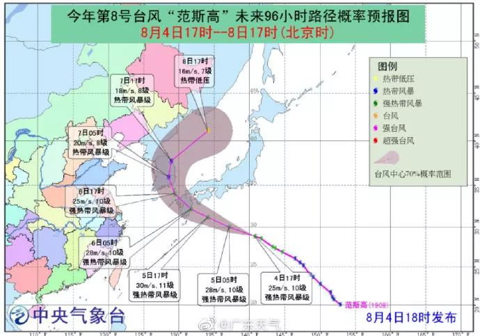 今年第8號臺風(fēng)"范斯高"(強(qiáng)熱帶風(fēng)暴級)的中心4日17時位于日本鹿兒島東偏南方約1020公里的西北太平洋洋面上,中心附近最大風(fēng)力10級(25米 /秒),中心最低氣壓為985百帕,七級風(fēng)圈半徑150-300公里。