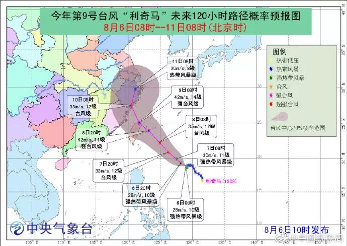預(yù)計,“利奇馬”將以每小時5公里左右的速度緩慢向西北方向移動,強度逐漸增強,最強可達(dá)臺風(fēng)級或強臺風(fēng)級(12-14級,35-45米/秒),逐漸向我國東南沿??拷N磥韮商鞂ξ覈:S驘o影響。