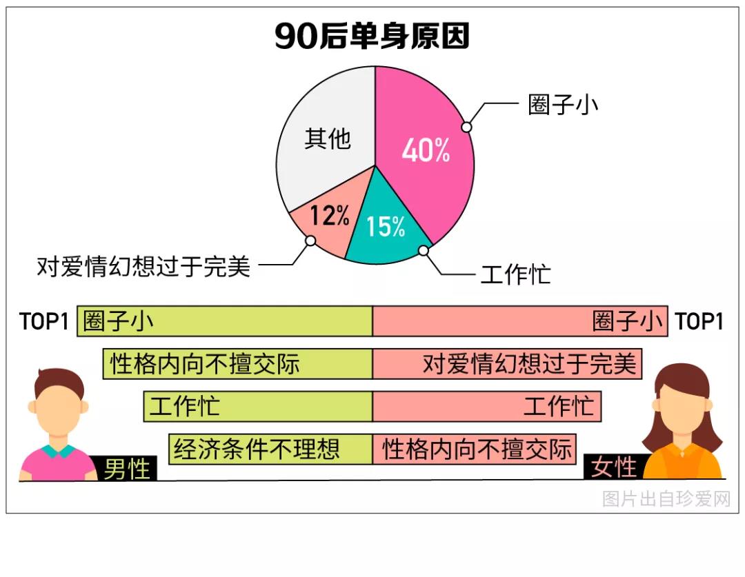 調(diào)查結(jié)果發(fā)現(xiàn),圈子小(40%)、工作忙(15%)、對(duì)愛(ài)情幻想過(guò)于完美(12%)為90后單身的主要原因。就性別差異而言,除了圈子小之外,男性單身的主要原因是性格內(nèi)向不擅交際(33.53%)、工作忙(32.07%)以及經(jīng)濟(jì)條件不理想(19.02%)。女性單身的主要原因則是對(duì)愛(ài)情幻想過(guò)于完美(29.67%)、工作忙(28.04%)及性格內(nèi)向不擅交際(14.82%)。從學(xué)歷背景看,學(xué)歷越高越容易受困于生活圈子小和工作忙帶來(lái)的擇偶問(wèn)題,而且博士人群對(duì)愛(ài)情幻想過(guò)于完美的比例比其他學(xué)歷的人群更高。