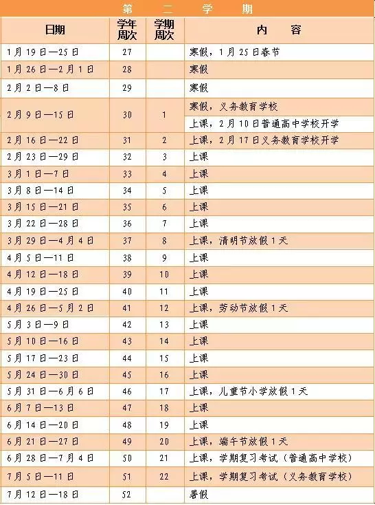 第一學(xué)期年20周,2019年9月1日至9月7日為第一學(xué)期第1周,9月2日開學(xué),寒假從2020年1月19日開始;第二學(xué)期22周,2020年2月9日至2月15日為第二學(xué)期第1周,2月10日開學(xué),暑假從2020年7月12日開始。