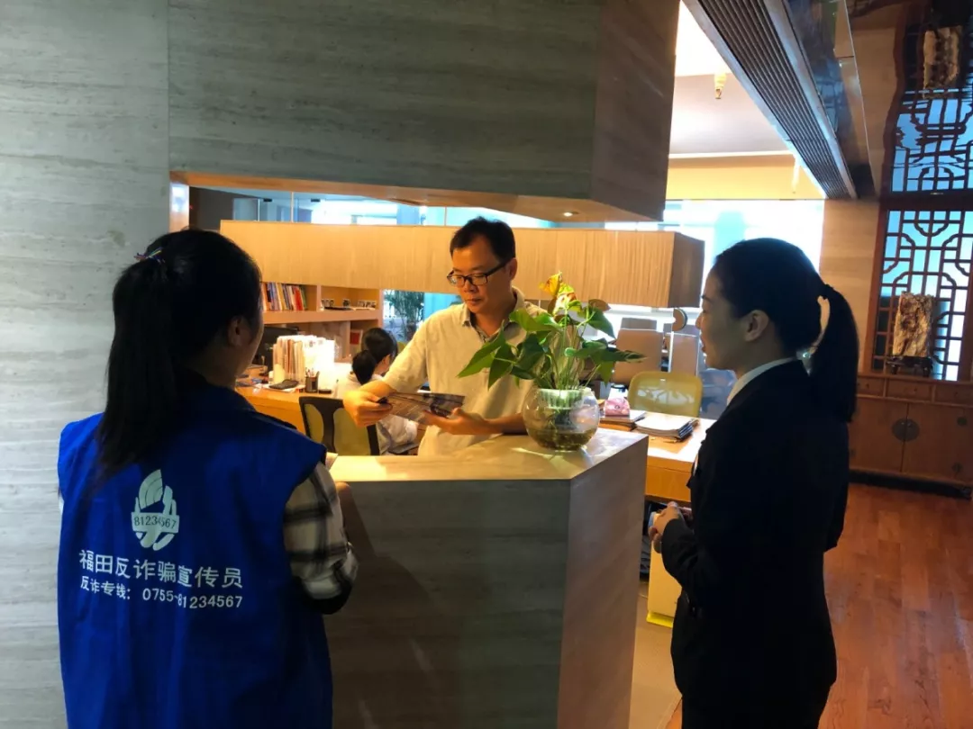 上午10時,深圳市公安局福田分局派出“藍馬甲”宣傳隊走入大中華國際交易廣場,逐層逐戶向企業(yè)員工們派發(fā)反詐騙宣傳單及《福田反詐騙教育專刊》?!八{馬甲”宣傳隊員走進各企業(yè)辦公室,向企業(yè)員工派發(fā)相關(guān)資料,講解反詐騙知識。各企業(yè)員工積極參與,與“藍馬甲”講師頻頻互動,并認真學(xué)習(xí)反詐騙技巧,努力提升自身反詐騙能力。
