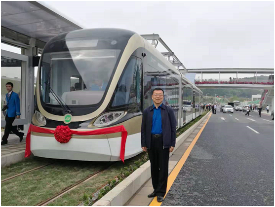 深圳龍華現(xiàn)代有軌電車開通現(xiàn)場(chǎng),簡(jiǎn)煉與電容供電無接觸網(wǎng)的有軌電車合影。