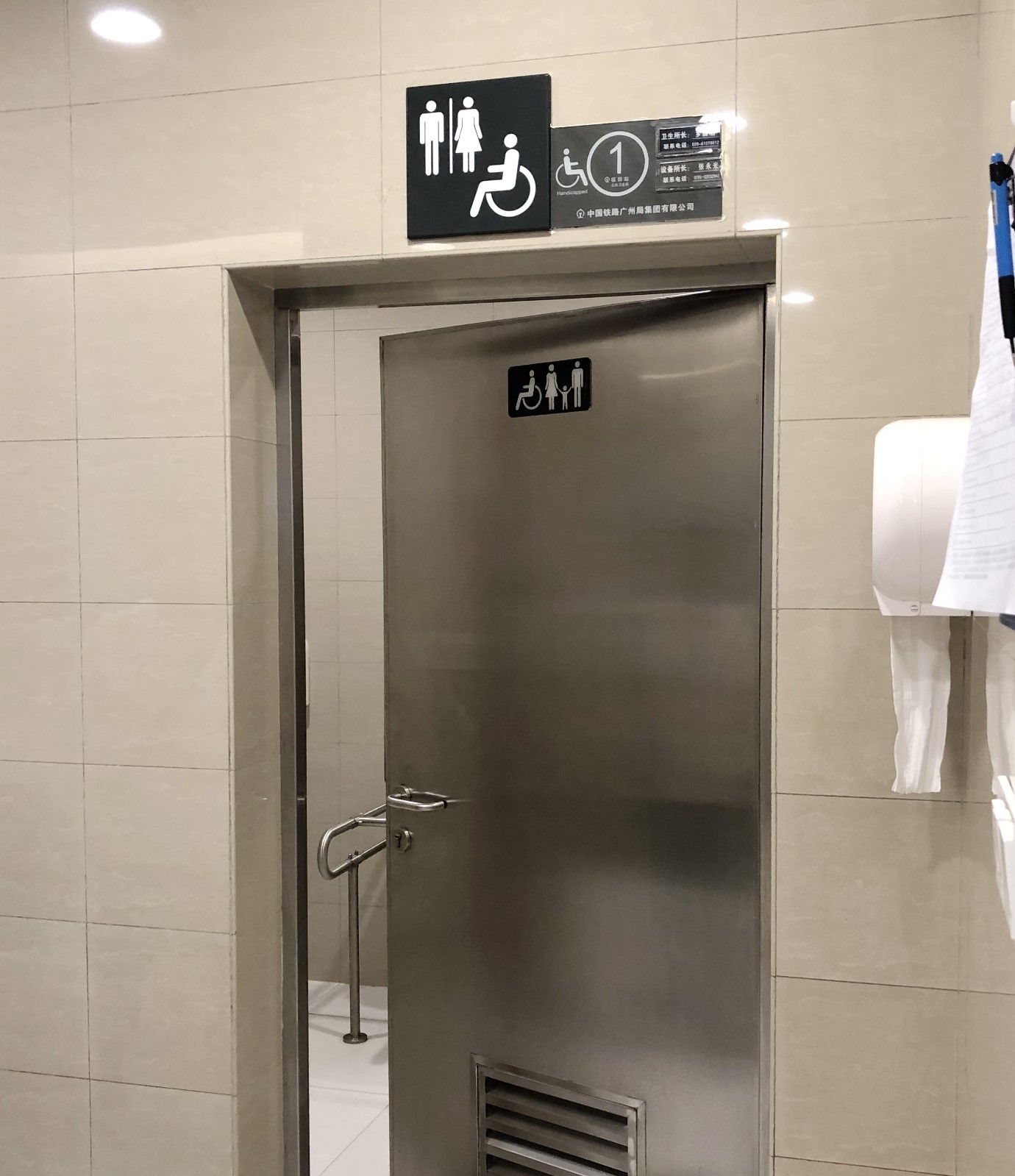 ▲同時(shí)記者留意到,在高鐵站沿路的洗手間指引標(biāo)識牌上,僅標(biāo)注了男女洗手間和殘疾人洗手間的標(biāo)識,卻沒有第三方洗手間的指引標(biāo)識,只有在殘疾人洗手間的門上才能看到“一家三口手拉手”的圖案標(biāo)識,不方便有需要的市民“按圖索驥”。且該洗手間位置處于男洗手間入口通道內(nèi),如果女性帶孩子進(jìn)入使用,不免有些尷尬。
