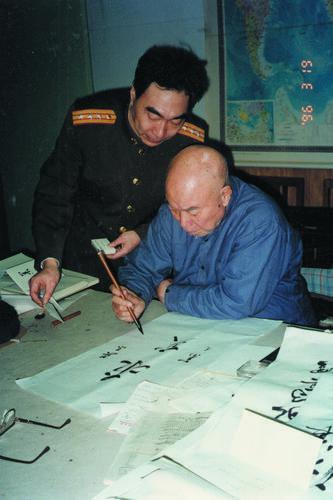 ▲1996年軍旅作家吳東峰(左)到開國上將肖克(右)家中采訪時(shí),蕭克將軍在他墨香陣陣的書房內(nèi)給他寫下‘求實(shí)’兩個(gè)大字。