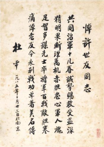 在采訪一位又一位身經(jīng)百戰(zhàn)的幸存者時(shí),吳東峰與他們的筆墨緣也就此結(jié)下?!?985年許世友將軍因病逝世,杜平將軍親手書寫‘悼許世友同志’詩一首,請(qǐng)我送《人民日?qǐng)?bào)》刊登,我把詩傳真過去,原件保存下來了。這首詩見證了杜平與許世友的深厚友情,是我最早的將軍墨跡手藏。那之后,我開始有意識(shí)地收集將軍們的筆墨?!?/p>