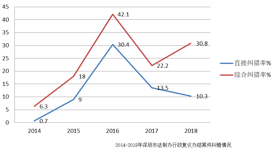 2018年深圳行政復(fù)議案件數(shù)量大幅減少,這可能與“兩隨機(jī)一公開”執(zhí)法全面推廣后執(zhí)法規(guī)范性進(jìn)一步提高和執(zhí)法爭議減少有關(guān)。辦結(jié)的行政復(fù)議案件中,被撤銷或確認(rèn)違法的案件比例繼續(xù)降低,但裁定終止的案件總件數(shù)雖略少于上年,比例卻有一定幅度上升??傮w而言,行政復(fù)議的直接糾錯率有所下降,但間接糾錯率有所上升,較好發(fā)揮了行政復(fù)議對行政執(zhí)法的監(jiān)督作用。