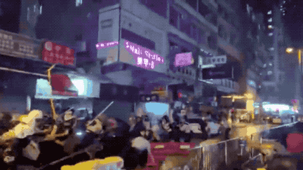 ④25日晚,激進(jìn)示威者在荃灣沙咀道與警方發(fā)生沖突,一度向警員進(jìn)逼,警方后退。危急之下,現(xiàn)場至少有3名警察拔槍,現(xiàn)場傳出槍聲。