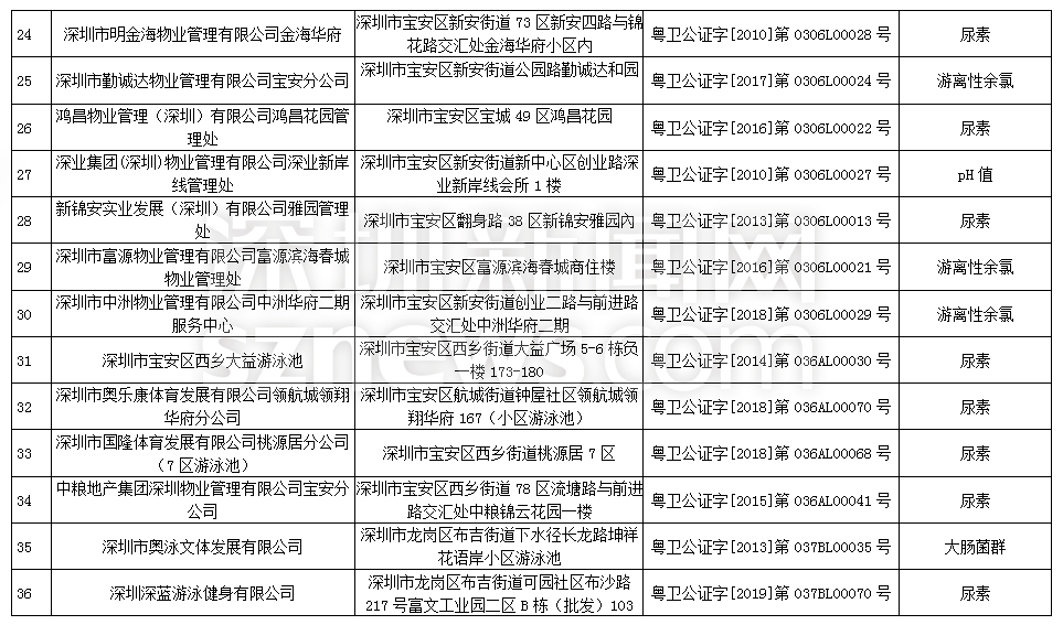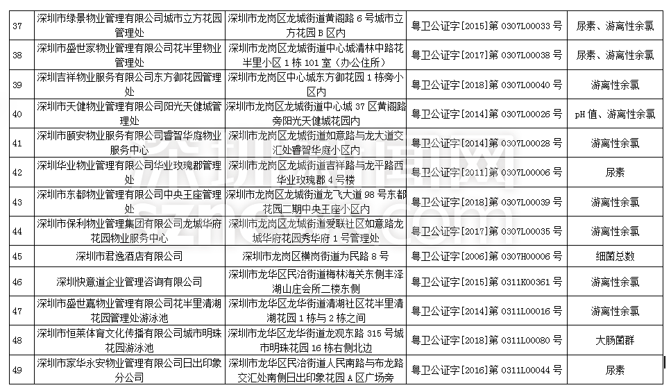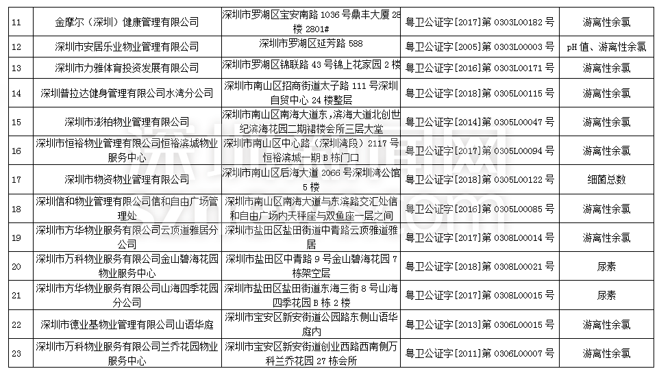 此次檢查結(jié)果顯示,深圳明門偉健體育服務(wù)有限公司(游泳池)、深圳市綠景物業(yè)管理有限公司城市立方花園管理處(游泳池)、深圳市盛世家物業(yè)管理有限公司花半里物業(yè)管理處(游泳池)尿素、游離性余氯兩項(xiàng)檢測指標(biāo)不合格,深圳市力美健華聯(lián)健身有限公司(游泳池)pH值、尿素兩項(xiàng)檢測指標(biāo)不合格,錦龍?bào)w育文化發(fā)展(深圳)有限公司(游泳池)、深圳市安居樂業(yè)物業(yè)管理有限公司(游泳池)、深圳市天健物業(yè)管理有限公司陽光天健城管理處(游泳池)pH值、游離性余氯兩項(xiàng)檢測指標(biāo)不合格,此外,有45家游泳場所分別因pH值、尿素、游離性余氯、細(xì)菌總數(shù)以及大腸菌群等指標(biāo)不合格被予以通告。衛(wèi)生監(jiān)督部門已責(zé)令抽檢結(jié)果不合格單位立即整改。