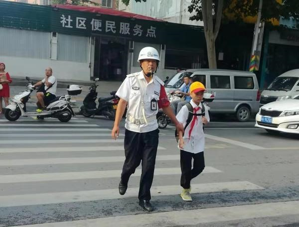 不停地牽手護送剛開學(xué)的學(xué)生過馬路。