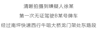 深圳交警立即展開調查,于2019年8月27日清晰拍攝到嫌疑人徐某第一次無證駕駛B某號牌車,經過南坪快速西行牛咀大橋龍門架處東路段。