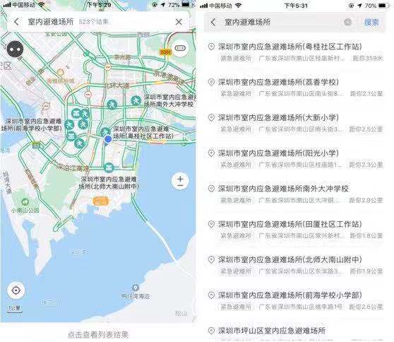 目前,深圳市已建成的592處室內(nèi)應(yīng)急避難場所位置信息已經(jīng)標注在騰訊地圖上。深圳市民可在騰訊地圖APP端,或在“騰訊地圖+”微信小程序中,搜索“室內(nèi)應(yīng)急避難場所”,獲取附近所有室內(nèi)應(yīng)急避難場所的地理位置、名稱、地址、緊急聯(lián)系電話等信息,同時可一鍵導(dǎo)航,盡快抵達。