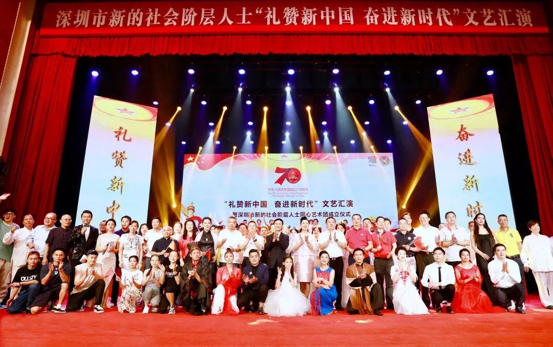 演出前,深圳市新的社會(huì)階層人士同心藝術(shù)團(tuán)揭牌。本次文藝匯演是在市委統(tǒng)戰(zhàn)部指導(dǎo)下,以及各區(qū)統(tǒng)戰(zhàn)部門支持下,由市新聯(lián)會(huì)牽頭,聯(lián)合各區(qū)新聯(lián)會(huì)共同舉辦的獻(xiàn)禮新中國(guó)成立70周年慶?;顒?dòng)之一。現(xiàn)場(chǎng)氣氛喜慶溫馨,通過網(wǎng)絡(luò)直播的方式和場(chǎng)外新的社會(huì)階層人士和十多萬(wàn)名觀眾互動(dòng)。