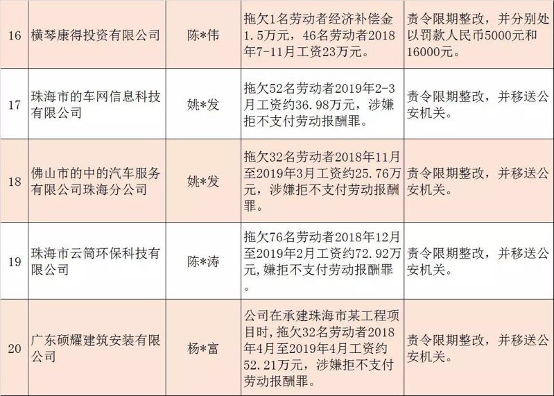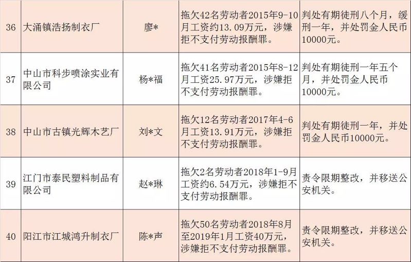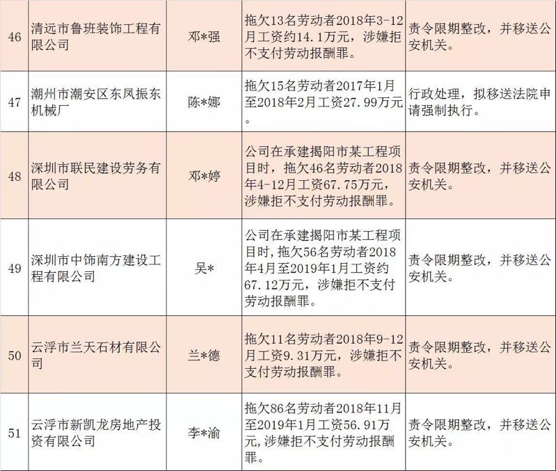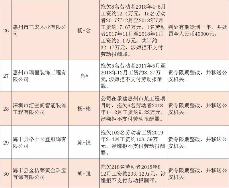 今年第二季度以來,廣東省人力資源社會(huì)保障行政部門繼續(xù)加大對(duì)欠薪等重大違法行為的打擊力度,各地特別是廣州、深圳、珠海、惠州、中山等地對(duì)欠薪逃匿、欠薪屢教不改、欠薪涉及人數(shù)和金額巨大等違法行為重拳出擊,依法處罰處理,對(duì)涉嫌犯罪的堅(jiān)決移送司法機(jī)關(guān)繩之以法,切實(shí)維護(hù)勞動(dòng)者的勞動(dòng)報(bào)酬等權(quán)益。為加強(qiáng)對(duì)違法用人單位的社會(huì)監(jiān)督,強(qiáng)化誠信體系建設(shè),加大威懾力,日前省人社廳披露了2019年第三批重大違法案件,這51家黑心企業(yè)中就有10家是深圳“揪”出來的(如圖)。