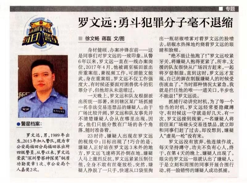 羅文遠(yuǎn),男,1989年出生,2013年加入警隊(duì),現(xiàn)為深圳市公安局福田分局福田派出所四級(jí)警員。從警以來(lái),羅文遠(yuǎn)榮獲“深圳警察神探獎(jiǎng)”銅質(zhì)功勛獎(jiǎng)?wù)?次、市公安局個(gè)人嘉獎(jiǎng)2次。