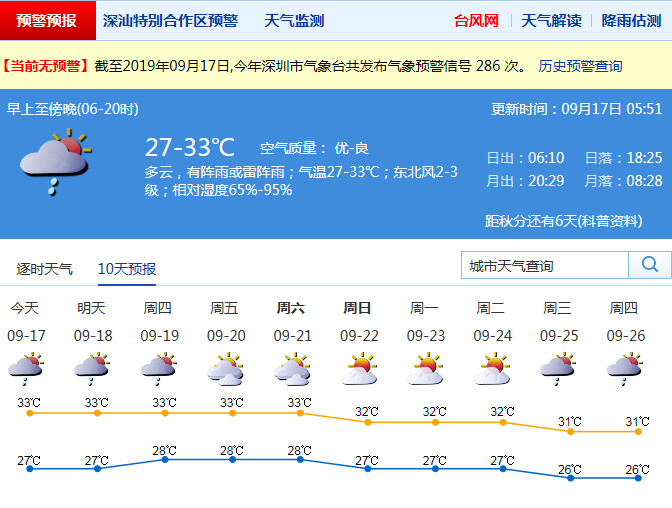 見(jiàn)圳客戶(hù)端·深圳新聞網(wǎng)2019年9月17日訊 記者從市氣象局了解到,深圳17日多云有陣雨或雷陣雨;氣溫27-33℃;東北風(fēng)2-3級(jí);相對(duì)濕度65%-95%。18-19日晴天間多云,天氣悶熱,午后局地有短時(shí)陣雨;20-23日晴熱干燥。