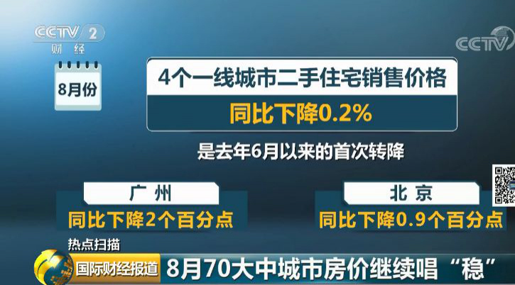 值得一提的是,代表一線城市房價風向標的二手住宅銷售價格同比下降0.2%,是去年6月以來的首次轉降,其中,廣州二手住宅銷售價格同比下降2個百分點,北京下降0.9個百分點。