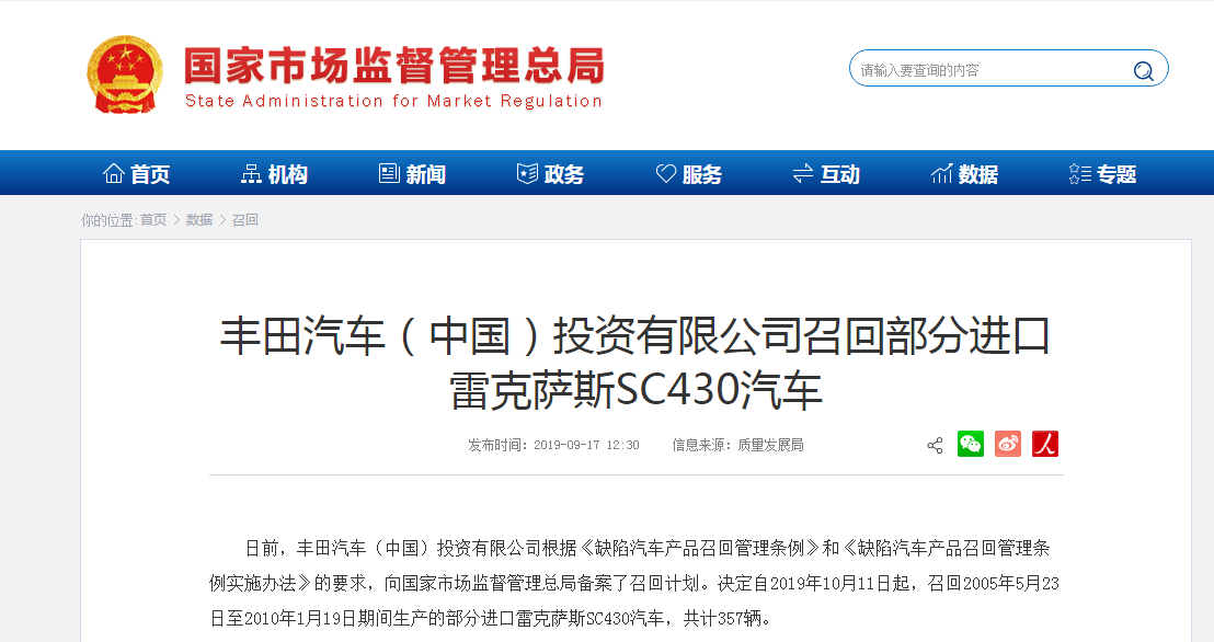 日前,豐田汽車(中國(guó))投資有限公司根據(jù)《缺陷汽車產(chǎn)品召回管理?xiàng)l例》和《缺陷汽車產(chǎn)品召回管理?xiàng)l例實(shí)施辦法》的要求,向國(guó)家市場(chǎng)監(jiān)督管理總局備案了召回計(jì)劃。決定自2019年10月11日起,召回2005年5月23日至2010年1月19日期間生產(chǎn)的部分進(jìn)口雷克薩斯SC430汽車,共計(jì)357輛。