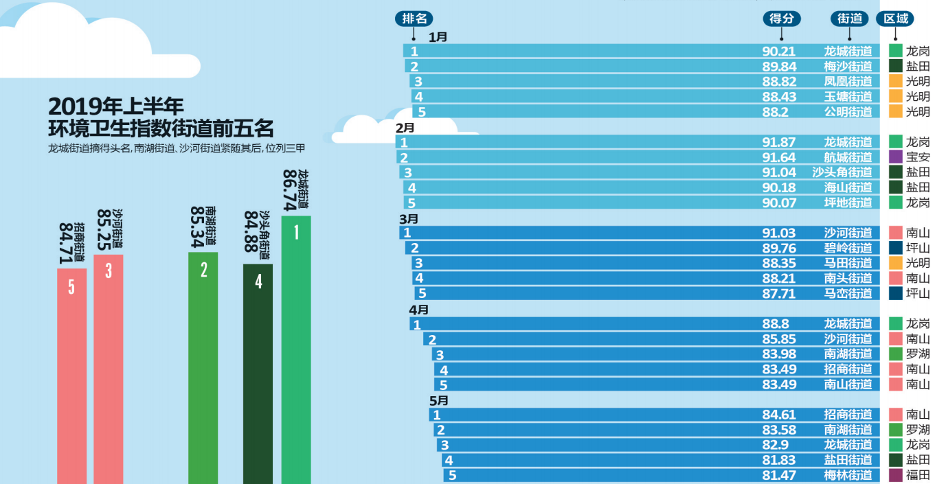 推進環(huán)境質(zhì)量邁進國際一流,深圳一直在行動。細心的市民可能早已發(fā)現(xiàn),深圳市城市管理和綜合執(zhí)法局官方網(wǎng)站每個月都會發(fā)布“深圳市環(huán)境衛(wèi)生指數(shù)排行榜”,為深圳的環(huán)境衛(wèi)生“打分”。據(jù)了解,深圳市環(huán)境衛(wèi)生指數(shù)測評排名已連續(xù)開展了兩年半,有效促進了全市環(huán)境衛(wèi)生的提升和轉(zhuǎn)變。今年上半年的“成績單”顯示,全市各區(qū)(新區(qū))各街道你追我趕,測評工作帶動社區(qū)環(huán)境改善,環(huán)境衛(wèi)生的整治提升得到了市民的廣泛認(rèn)可和好評。