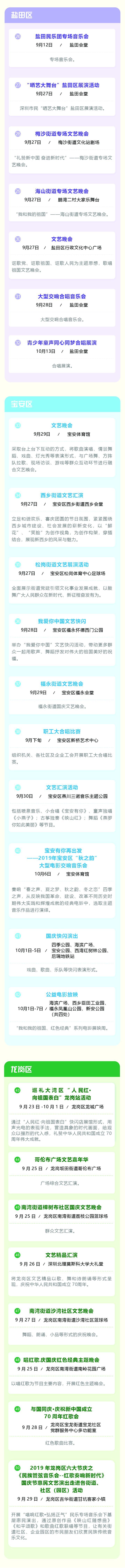 為慶祝中華人民共和國(guó)成立70周年,深圳市將舉辦專場(chǎng)音樂會(huì)、群眾文藝晚會(huì)、焰火晚會(huì)等活動(dòng),同時(shí)將舉行10場(chǎng)“愛我中華——南粵百園慶國(guó)慶”主題游園及80場(chǎng)“我和我的祖國(guó)”國(guó)慶群眾文藝嘉年華活動(dòng)。主題游園和文藝嘉年華活動(dòng)安排如下: