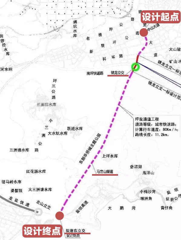 坪鹽通道北起坪山區(qū)現(xiàn)狀錦龍大道坪山大道路口,南至鹽田區(qū)鹽壩高速、鹽港東立交,全長(zhǎng)約11.252公里。