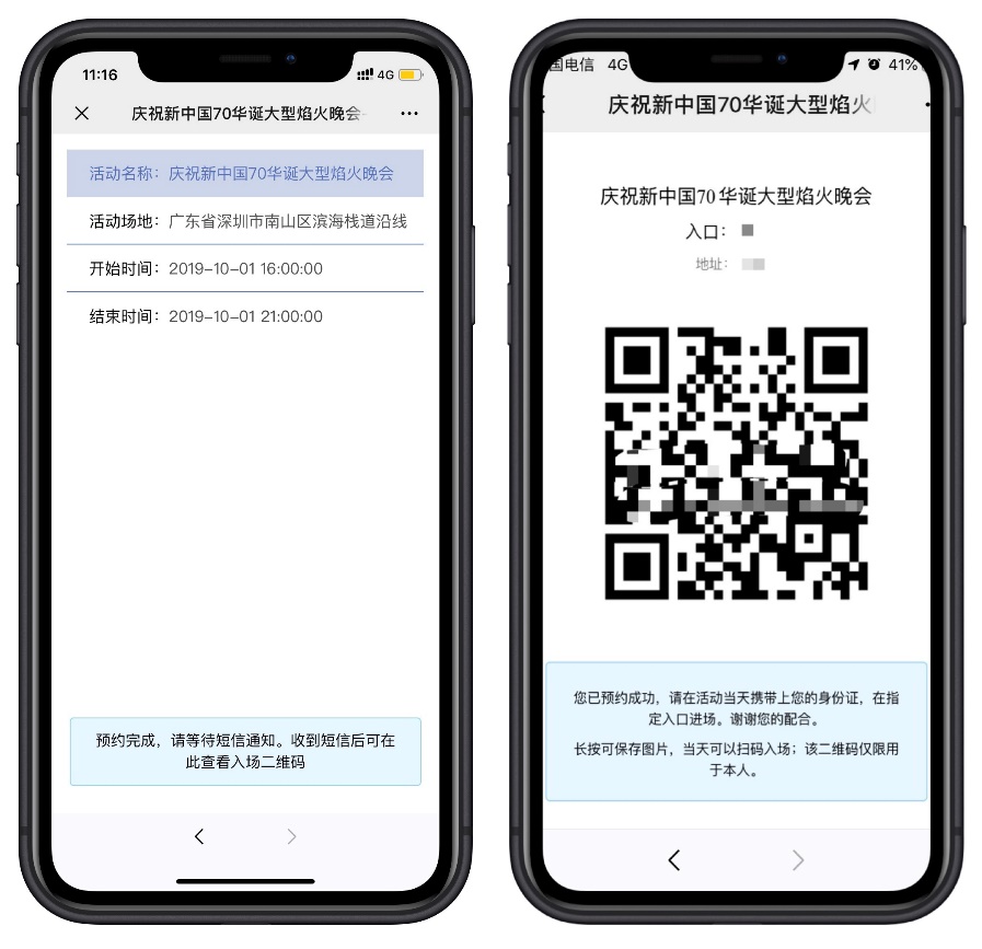 2.預約成功后將收到短信,預約頁面將生成二維碼,市民需憑此二維碼及本人身份證入場,如下圖所示: