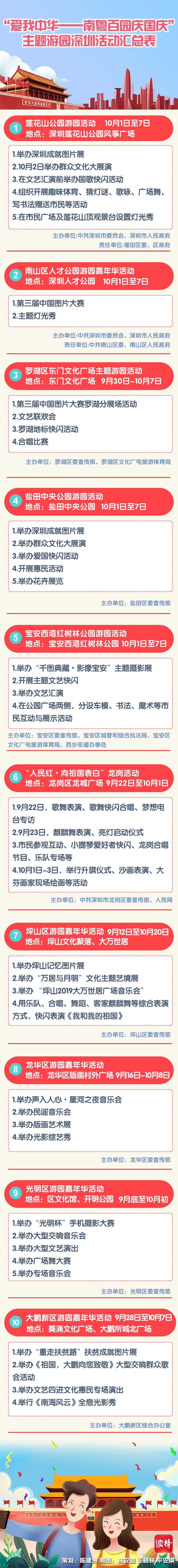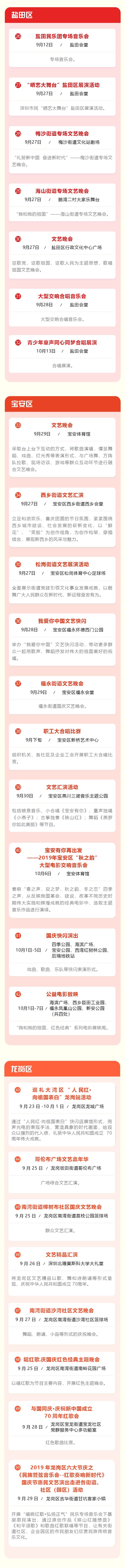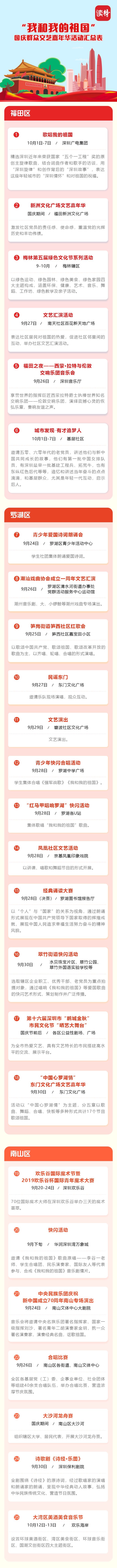 深圳特區(qū)報(bào)2019年9月26日訊 為熱烈慶祝中華人民共和國成立70周年,深圳市將舉辦規(guī)模盛大的全市性專場音樂會(huì)、群眾文藝晚會(huì)、焰火晚會(huì)等活動(dòng),同時(shí)將在各區(qū)舉辦80場“我和我的祖國”國慶群眾文藝嘉年華活動(dòng),并在全市各區(qū)舉行“愛我中華——南粵百園慶國慶”主題游園。各有關(guān)活動(dòng)安排如下: