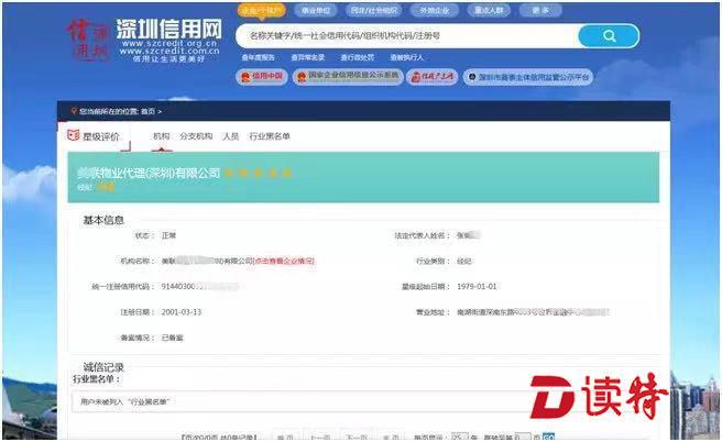 用戶登錄“深圳信用網(wǎng)”,只需根據(jù)頁(yè)面指示搜索相關(guān)鍵字,查詢頁(yè)面即可查到房地產(chǎn)中介機(jī)構(gòu)的注冊(cè)備案地址、注冊(cè)時(shí)間、星級(jí)評(píng)價(jià)以及誠(chéng)信記錄等信息。