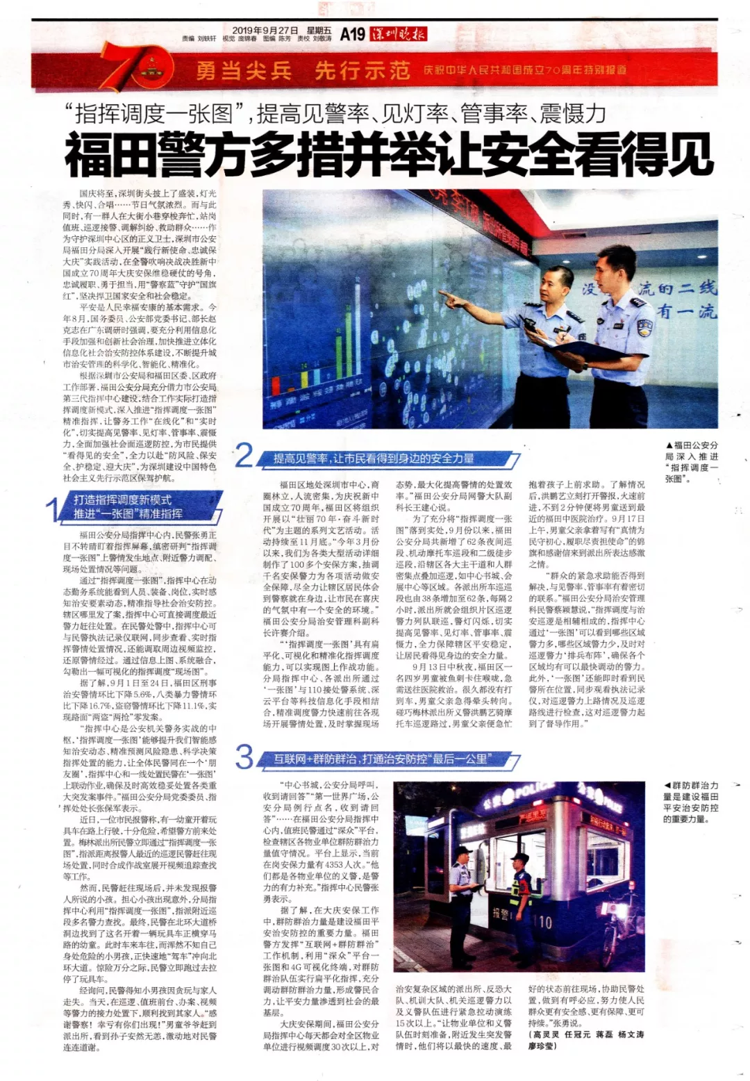 國慶將至,深圳街頭披上了盛裝,燈光秀、快閃、合唱……處處喜氣洋洋,節(jié)日氣氛濃烈。在這鮮艷亮麗的平安底色下,有一群人在大街小巷穿梭奔忙,站崗值班、巡邏接警、調(diào)解糾紛、救助群眾……作為守護(hù)深圳中心區(qū)的正義衛(wèi)士,深圳市公安局福田分局深入開展“踐行新使命、忠誠保大慶”實(shí)踐活動,在全警吹響決戰(zhàn)決勝新中國成立70周年大慶安保維穩(wěn)硬仗的號角,忠誠履職、勇于擔(dān)當(dāng),用“警察藍(lán)”守護(hù)“國旗紅”,努力營造平安祥和歡樂的節(jié)日氛圍,堅決捍衛(wèi)國家安全和社會穩(wěn)定。
