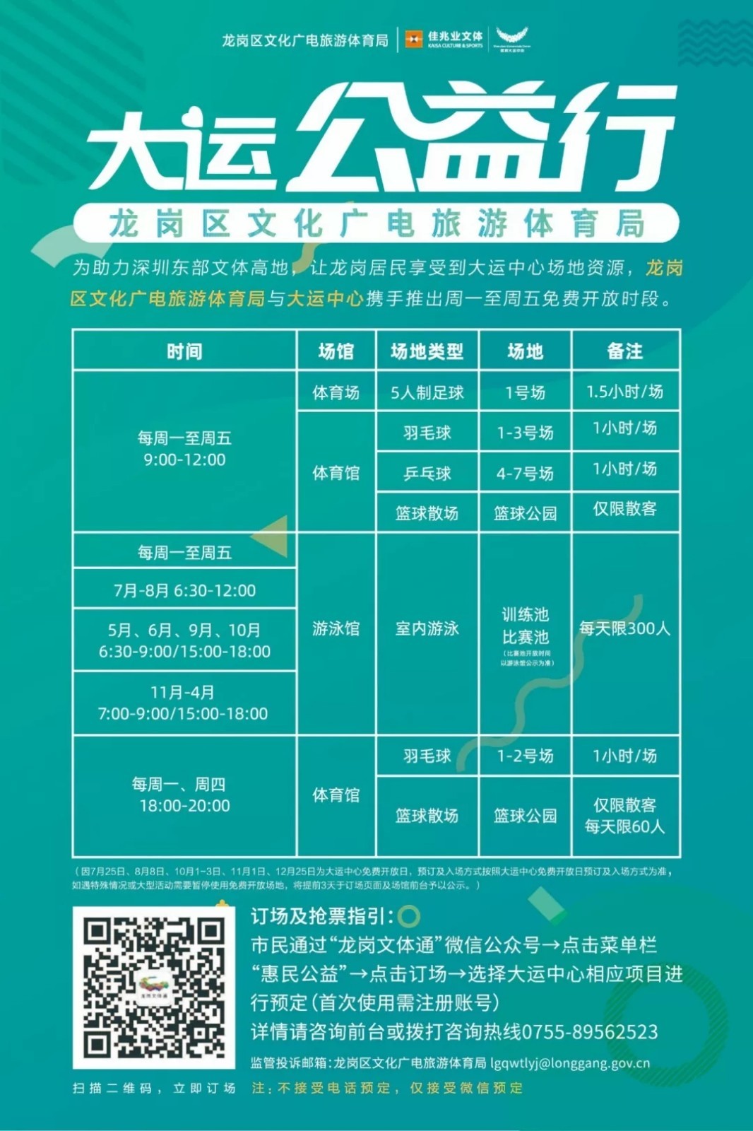 此外,龍崗區(qū)文化廣電旅游體育局與大運中心攜手推出的文體惠民開放項目周一至周五每天免費開放半天持續(xù)進行中,具體時間及搶票攻略如下: