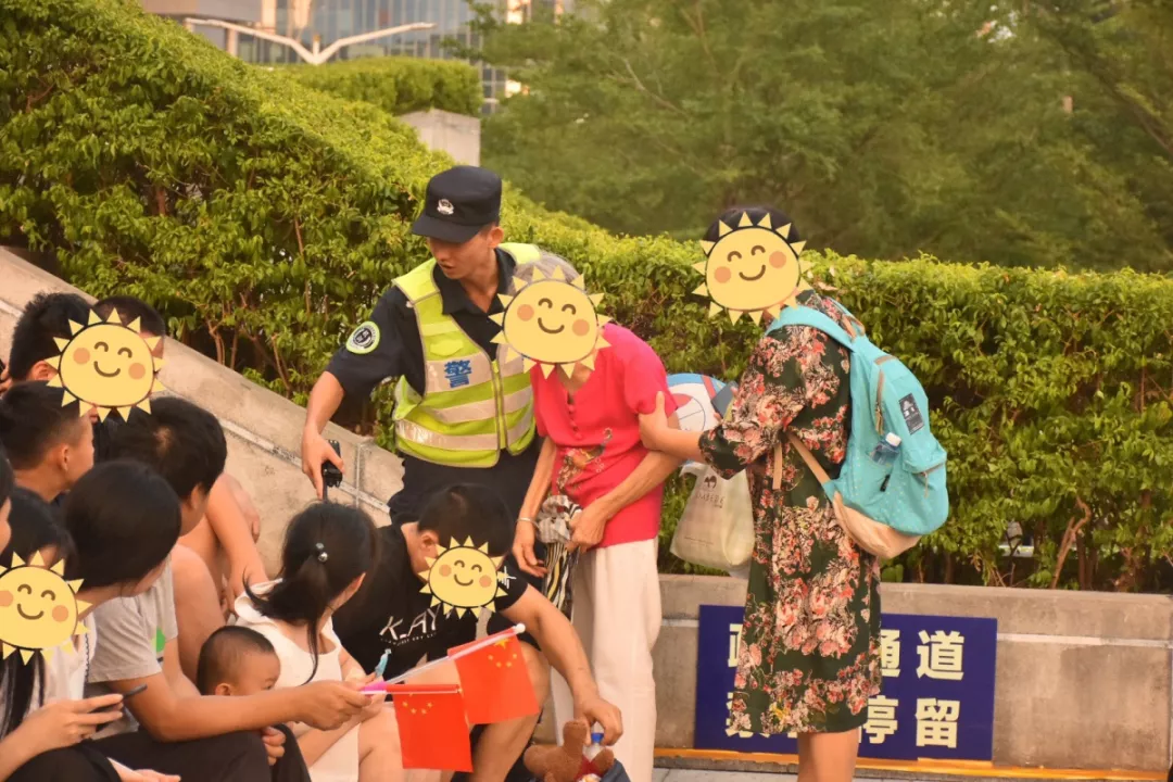10月2日燈光秀現(xiàn)場(chǎng),深圳市公安局福田公安分局機(jī)動(dòng)訓(xùn)練大隊(duì)摩托車中隊(duì)隊(duì)員幫助年邁的老奶奶尋找合適的觀燈位置。