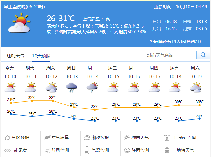 市氣象局預(yù)計(jì),10-11日晴天間多云,空氣干燥;12日多云,午后局部有雷陣雨;13日起受弱冷空氣影響,氣溫下降2-4℃,沿海、高地和海區(qū)最大陣風(fēng)7-8級(jí),其中13-14日有陣雨或雷陣雨;15-16日轉(zhuǎn)干燥天氣。